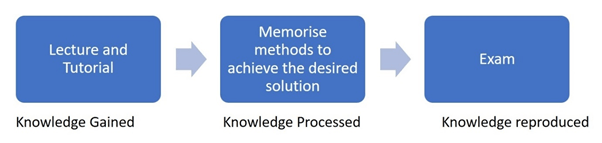 In our traditional model of learning is highly focused on exams. The lectures and tutorials form the main basis of the teaching, this is where the majority of the knowledge is learned, we then teach students how to solve the problem with a formula or method, students learn how to reach the answer using these methods and then students reproduce the results in the exams. We judge the exams to assess how well they have learned.